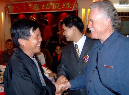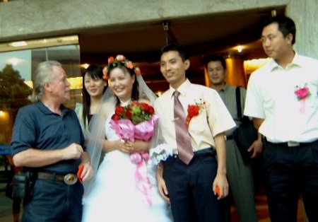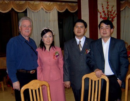 CaiRongShou and I are happy to have our picture taken with the bride and groom.