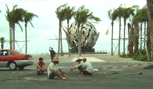 Every where I go I keep noticing how the work is always done so basically and by hand. Here some street repair is done by hammer and chisel, giving lots of people work since their are so many people here.