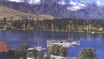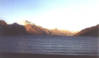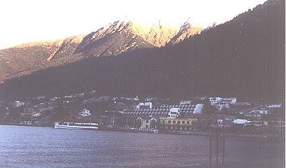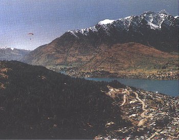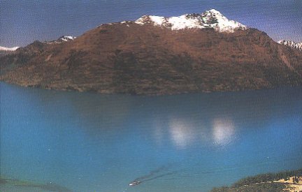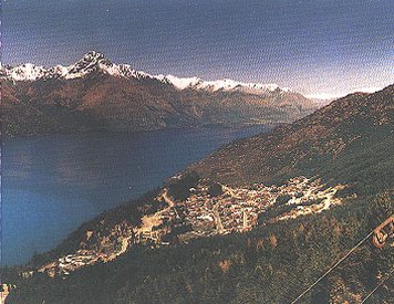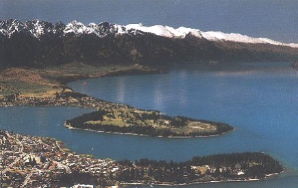 A view of Lake Wakatipu from The 'Remarkables' mountains 2343m on the left, Queenstown below, Cecil Peak 1974m in middle and Walter Peak 1815m on the far right.